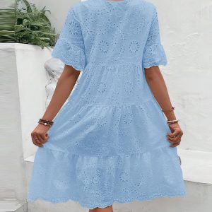 Women’s Lace Eyelet Short Sleeve Tiered Midi Long Dress Ruffle Hem Babydoll Short Dress