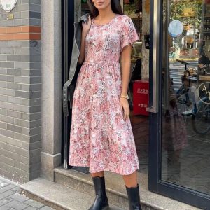Women’s Summer Dress Midi Floral Flutter Short Sleeve Casual Dresses with Pockets Tiered Flowy Boho Beach Dress