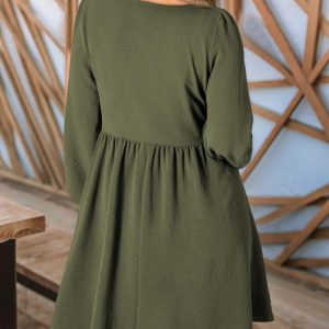 Womens 2025 Casual Dress Smocked Crewneck Button Up Long Sleeve Empire Waist A-Line Mini Dress