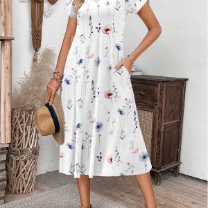 Womens Casual Dress for Summer Short Sleeve Pleated Dress Loose Flowy Beach Dress with Pockets Flare Midi Sundress