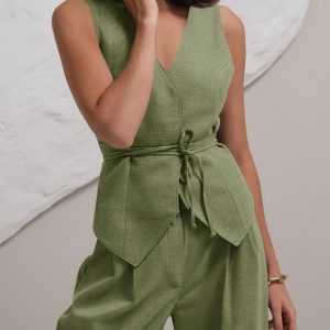 Womens 2 Piece Outfits V Neck Tie Waist Blazer Vest and Wide Leg Business Casual Suit Pants Sets