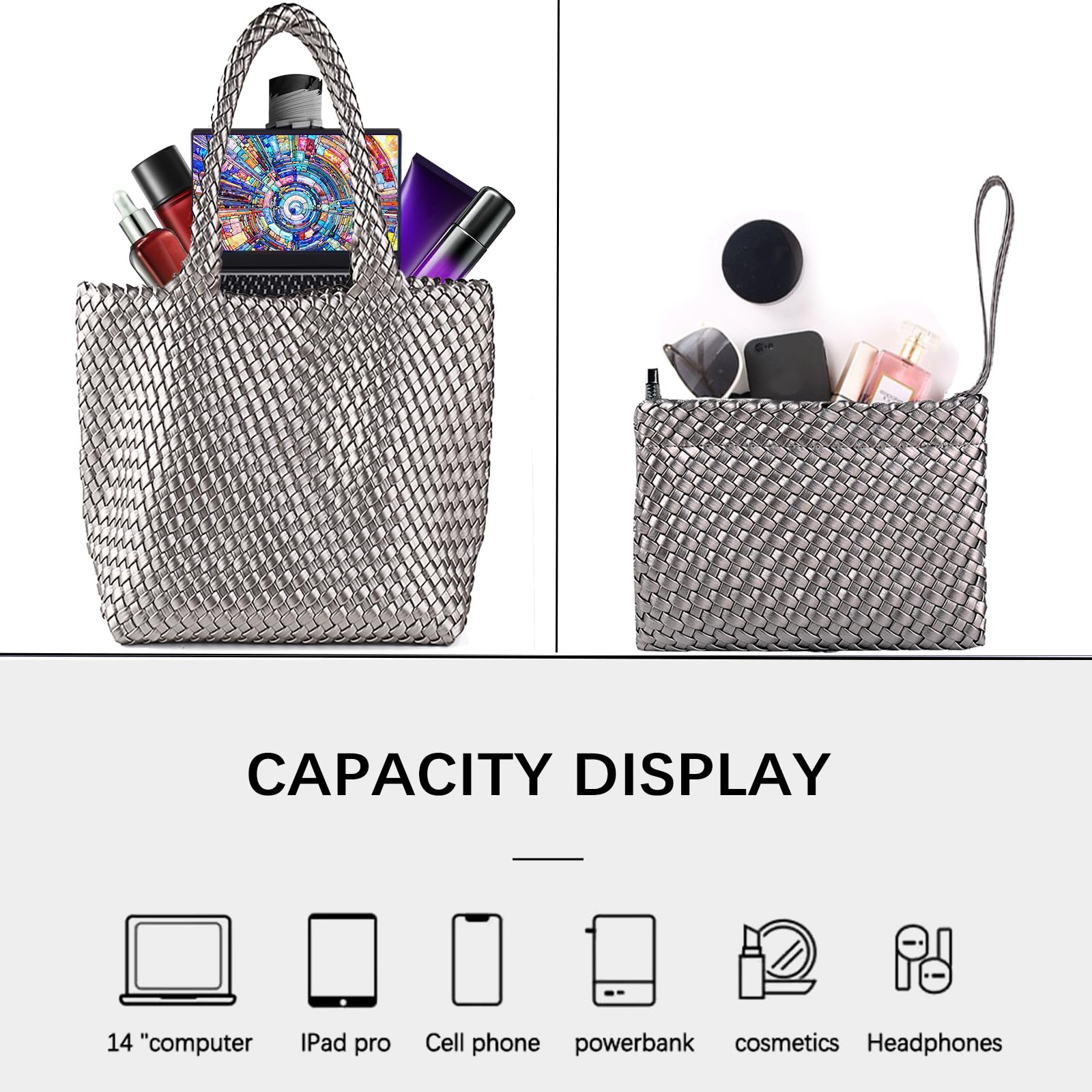 • Woven Bag Dimension: Main Pockets: 15.74 ” W x 6.69‘’ D x 11.41″ H. Interior Pockets: 9.84″ Wx7.48″ and can be worn as a pouch or detached and used as a wristlet(Because it is hand-woven, the size has a little error within the normal range, if you mind, please shoot carefully), such as cellphone for any size, mini iPad, keys, sunglasses, small books, jewelry, wallet, cosmetics and other necessities.Our woven bag offers both comfort and elegance and is the perfect handbag for women on the go