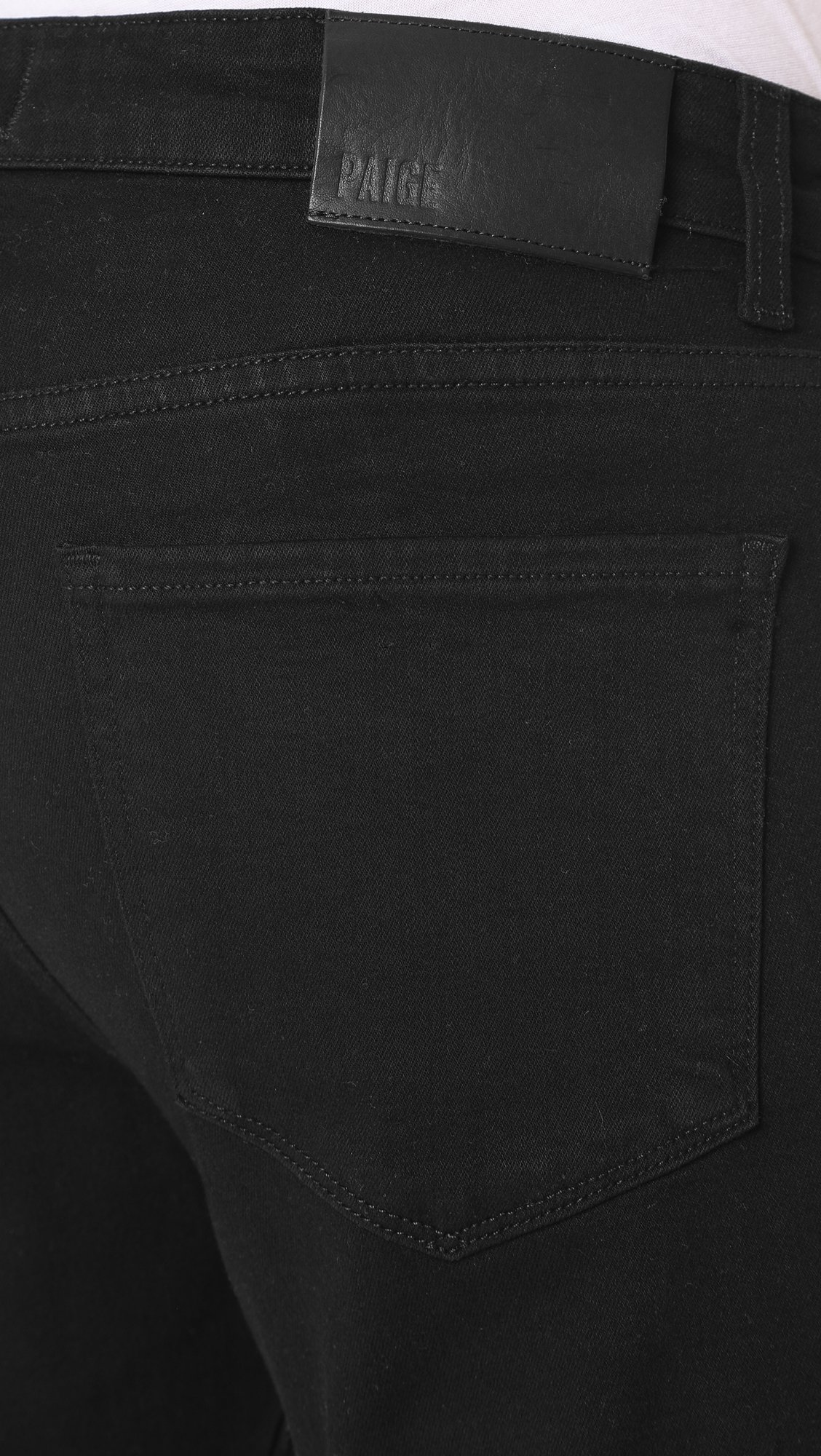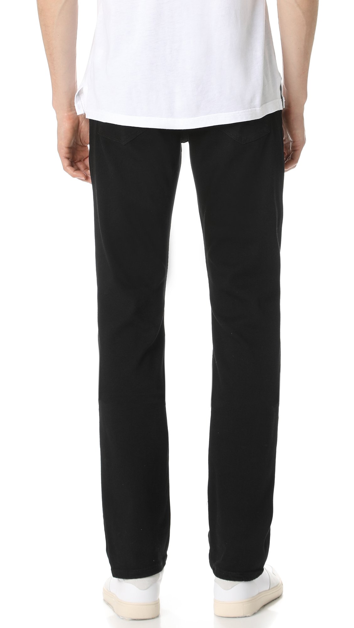 • Straight-fitting jean in uninterrupted black wash featuring five-pocket styling and clean back pockets