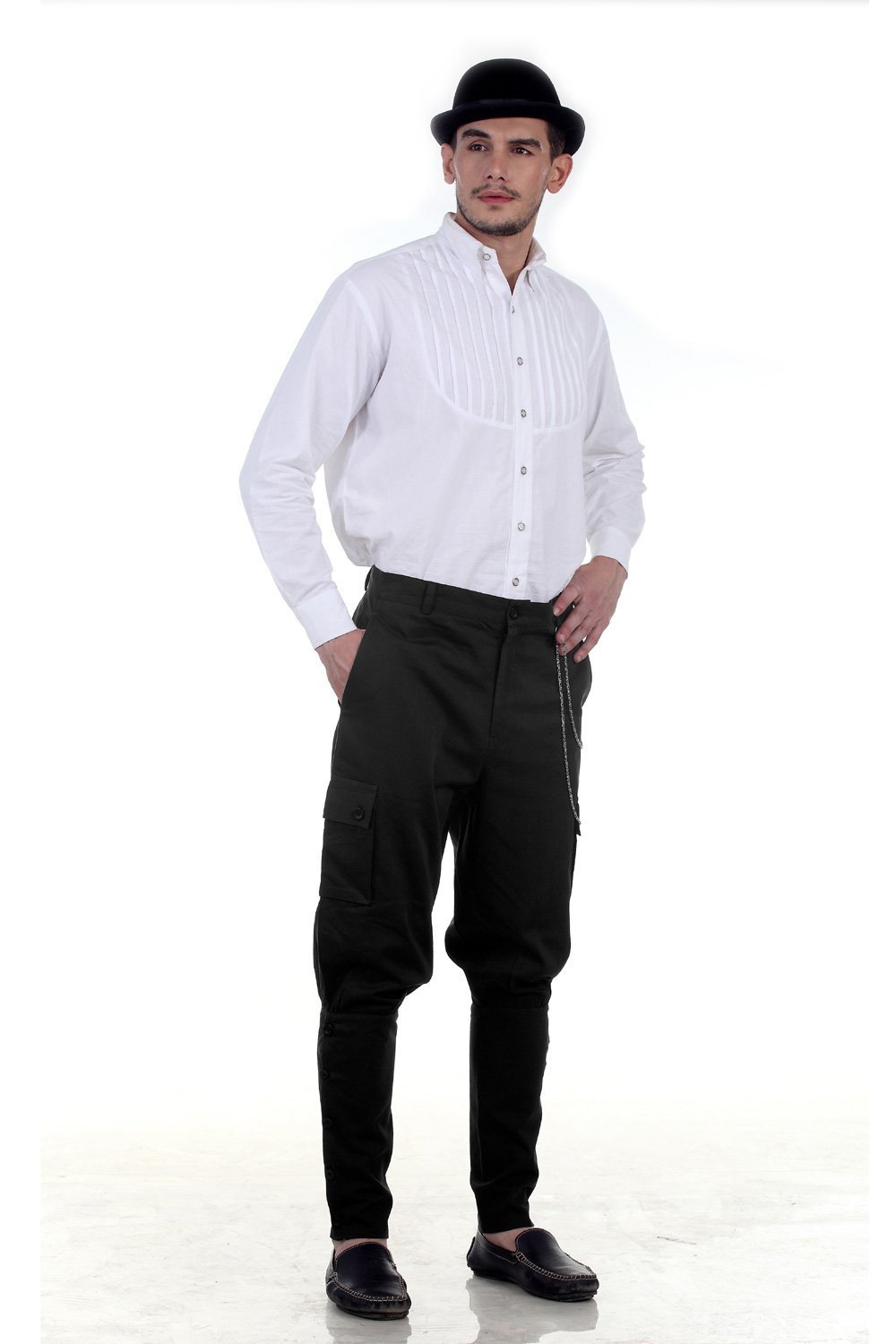 The Airship Steampunk Trousers are designed to emulate the appearance of an aircraft captain or a Victorian gentleman. Designed with comfortable and roomy flared hips and the upper leg portion, the pants become snug below the knee with the button closure. Styled with cargo pockets on both sides of the trouser with a D-ring to intensify the look.