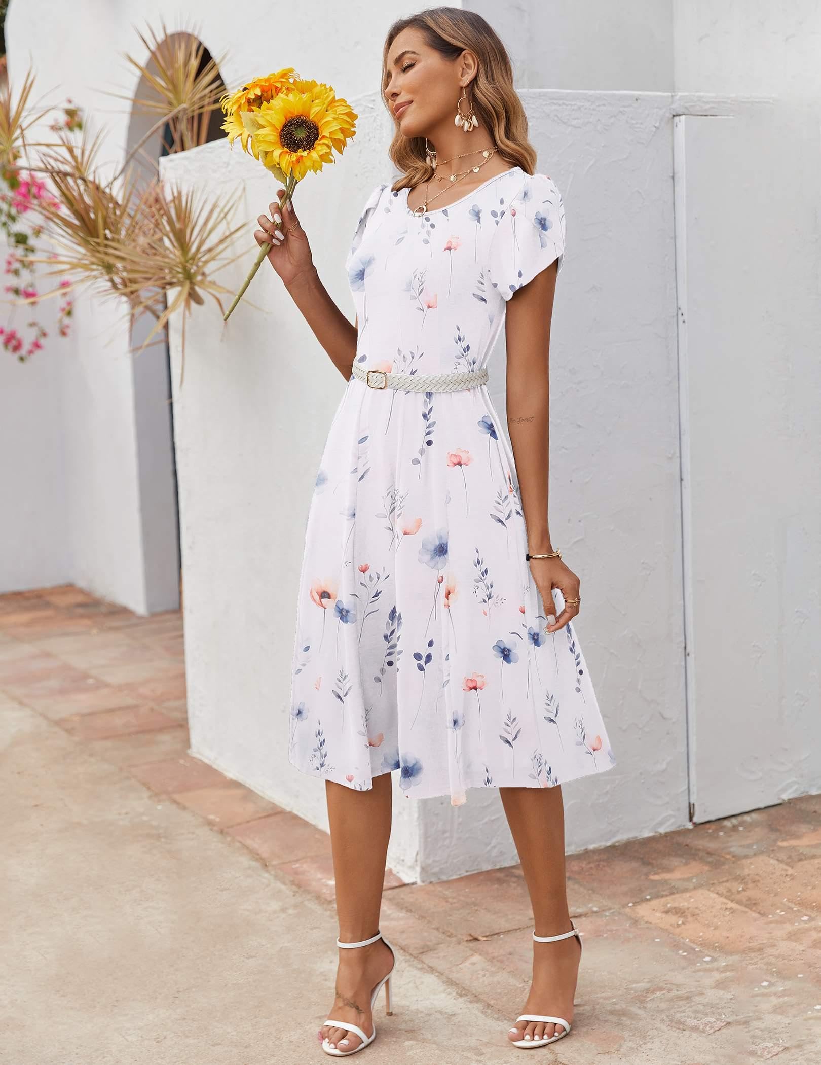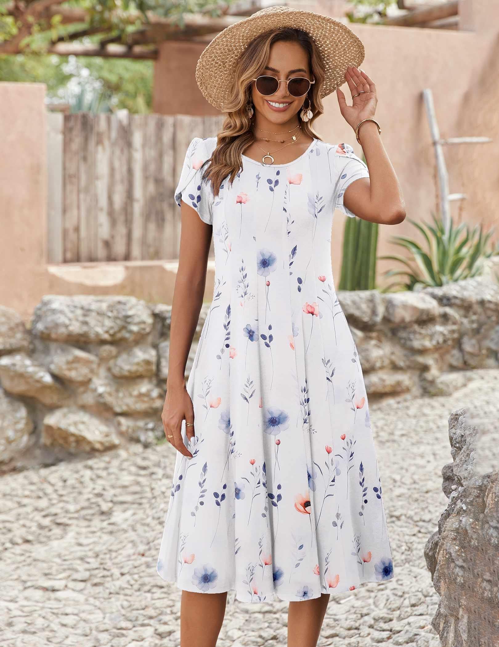 - 【Feature】: Short Sleeve Dresses With Floral Print And Solid Color, Crewneck,Short Petal Sleeves, 2 Side Pockets, Empire Wasit, No Linning, Flattering Cut,Below Knee-Length,A-Line Style,Pleated Flare Dress. The Fabric Neither Thin Nor Thick. Gives You A Casual And Stylish Look While Staying Cool And Comfortable