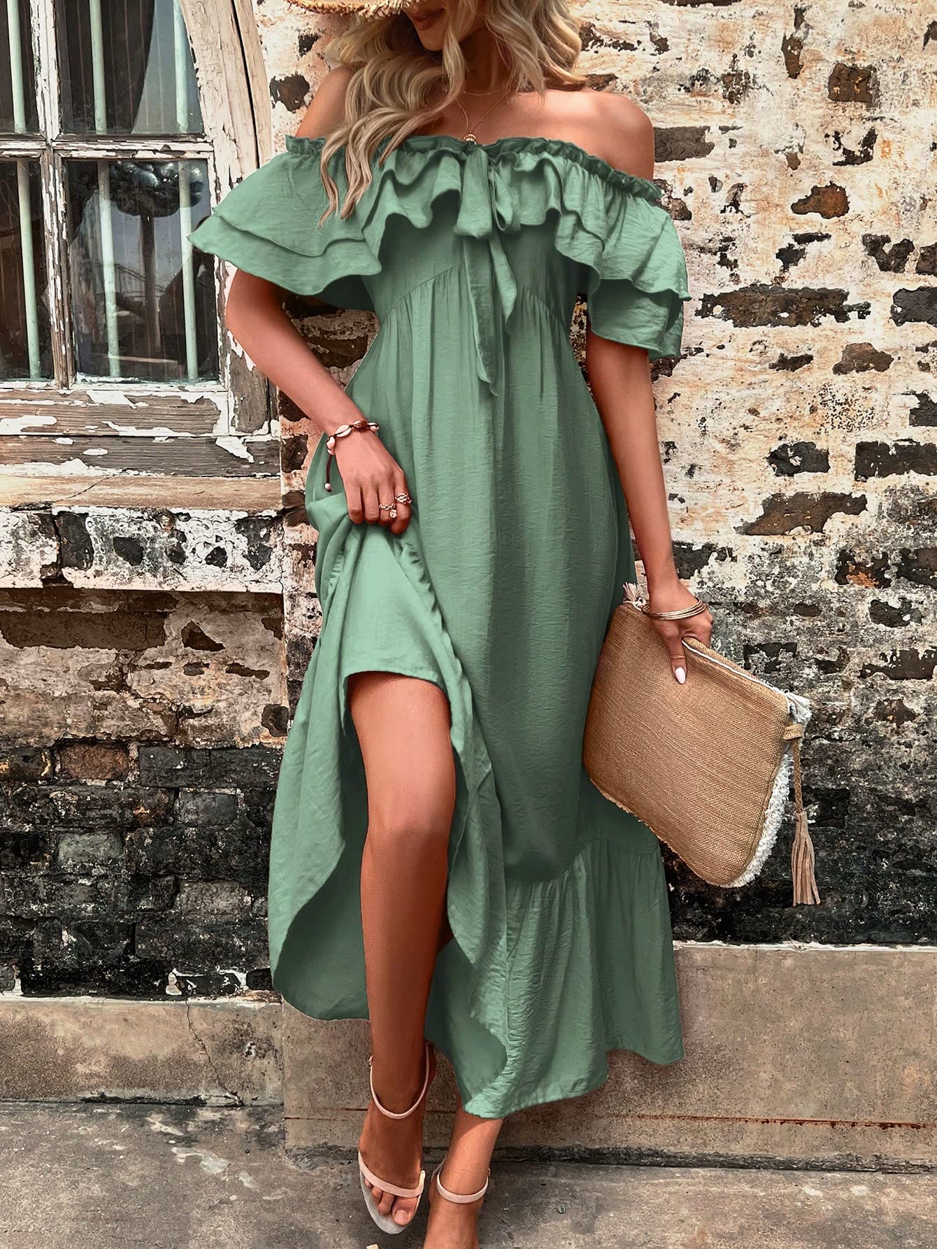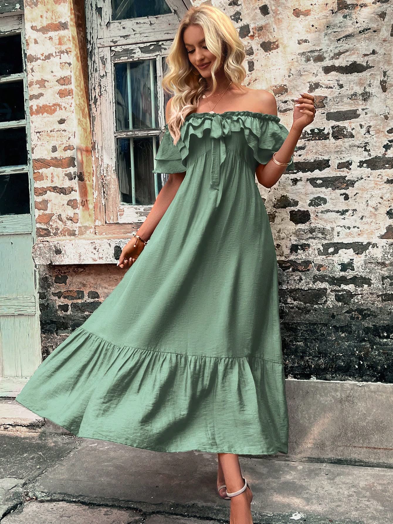Women’s Dress Off Shoulder Frill Trim Tie Front Ruffle Hem Dress Dress IPADSA (Color : Mint Green, Size : Small)