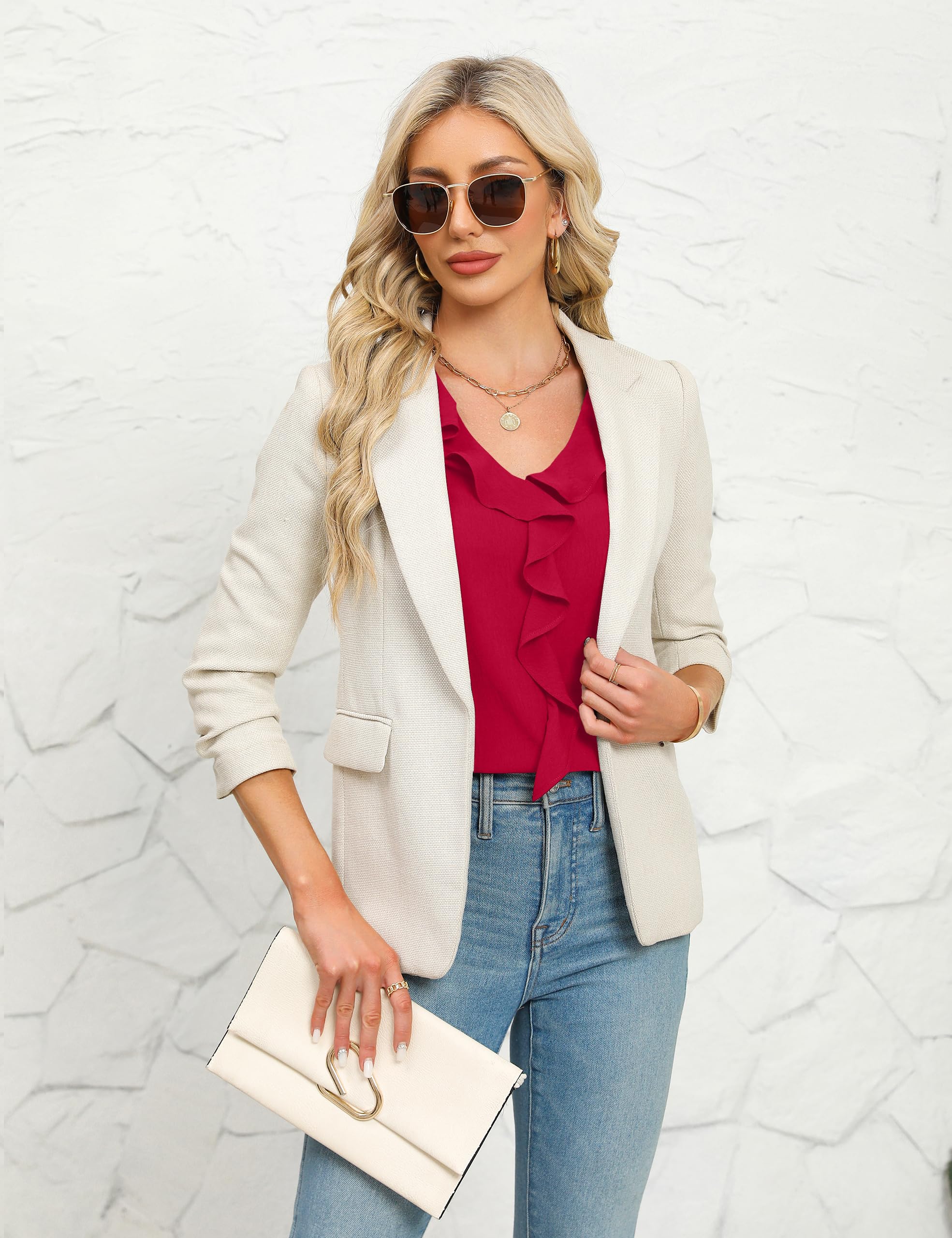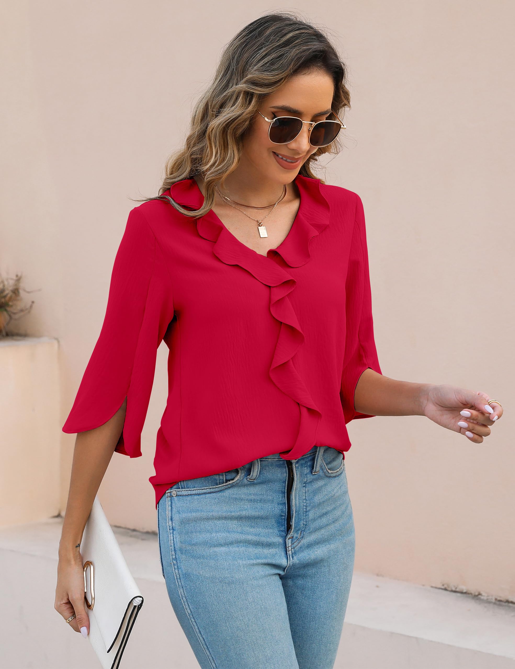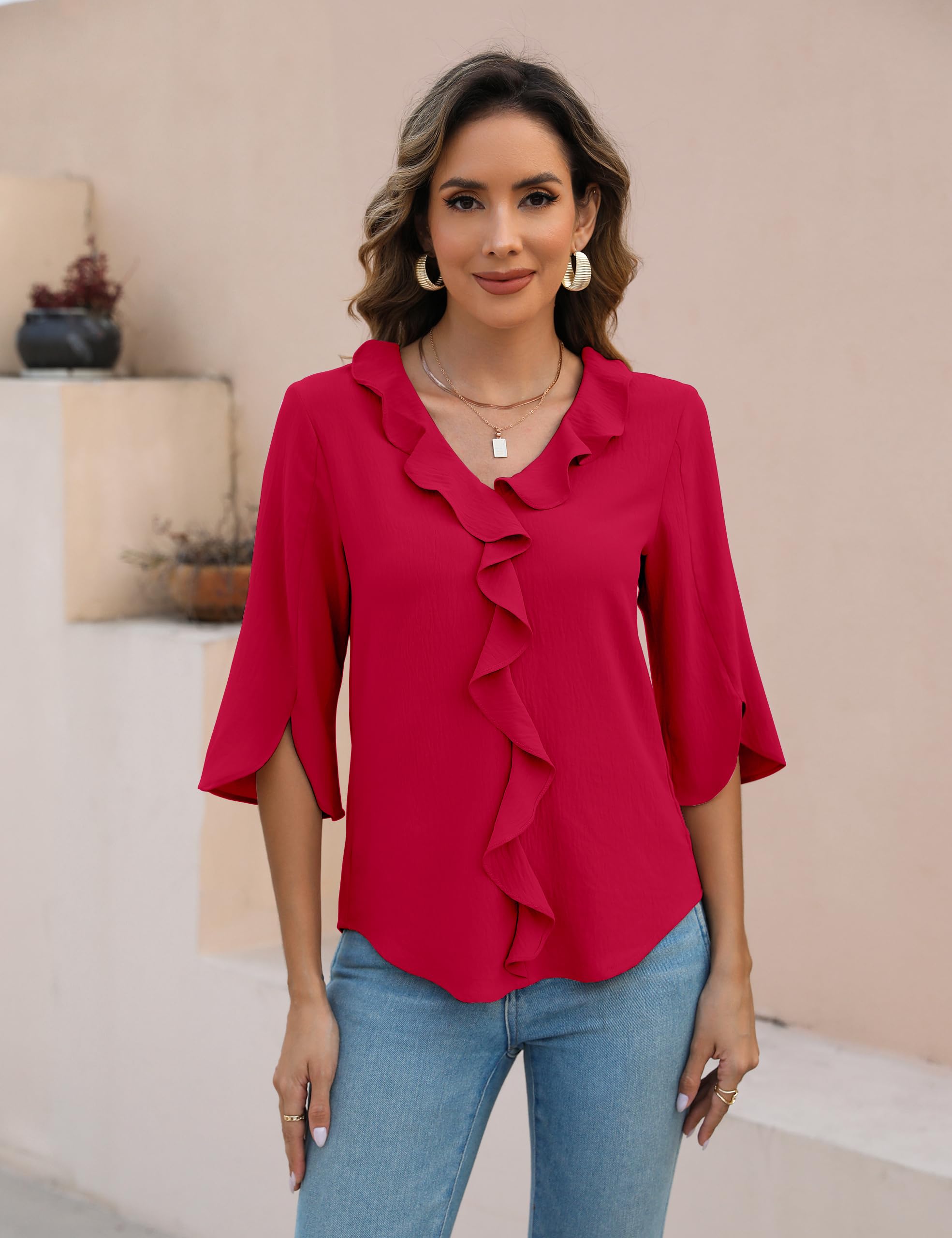 - RUFFLE DETAIL – Adorned with cascading ruffle trim, business casual tops for women create a visually stunning effect from neckline to hem. The airy and romantic design offers versatility, making it suitable for both business and casual outings.