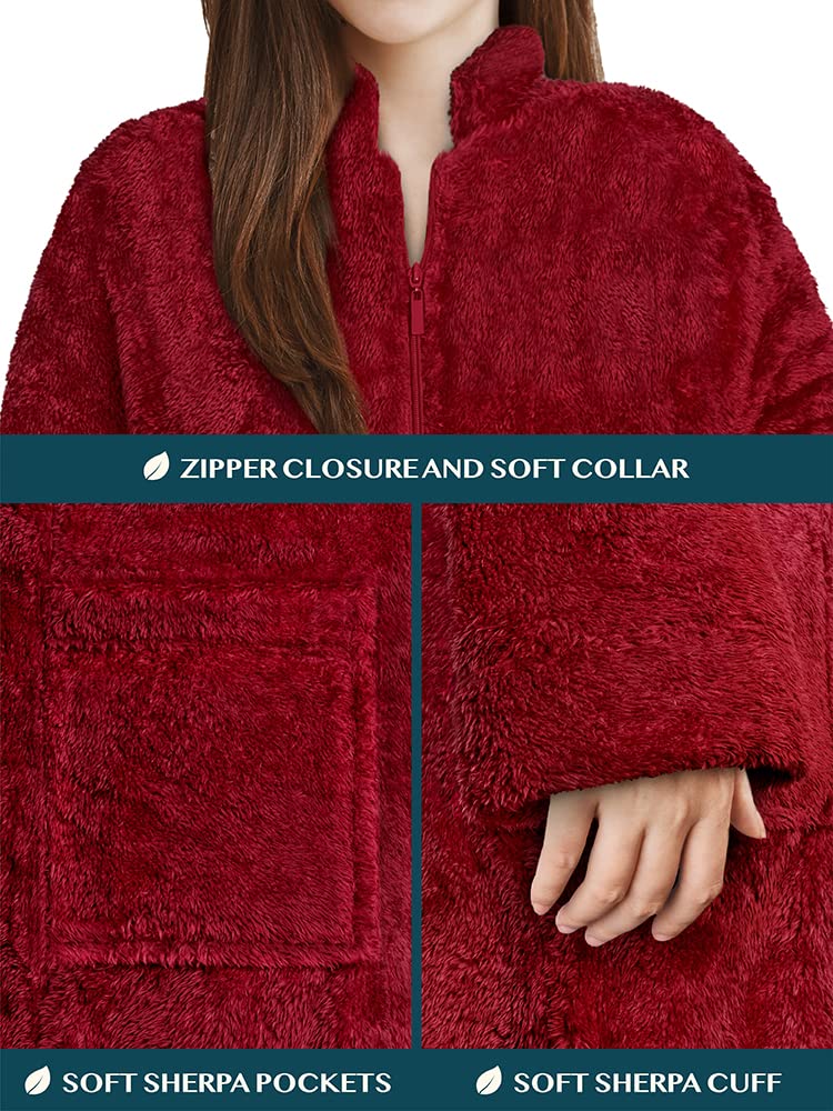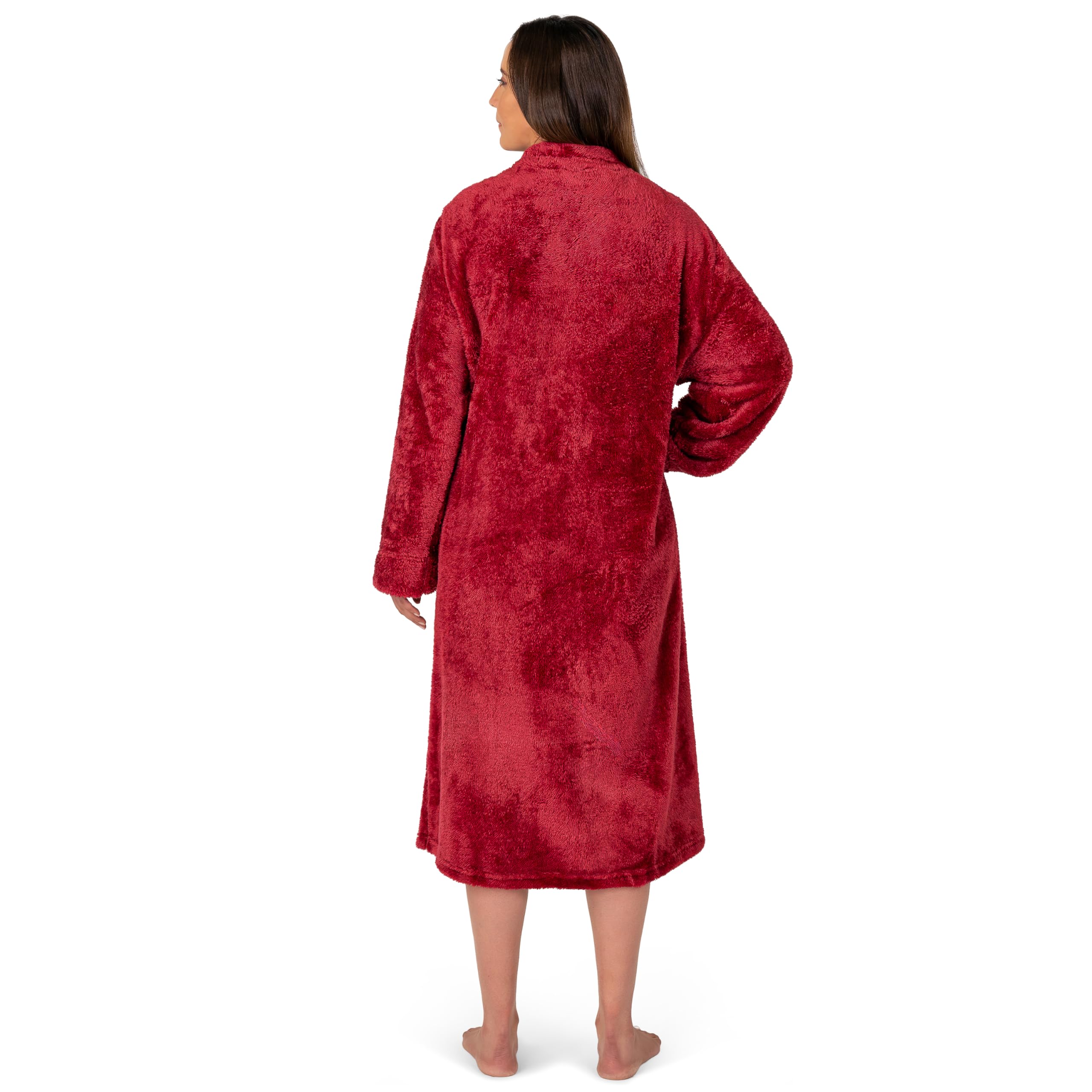 - ZIP UP ROBE FUZZY SHERPA: Our shaggy fleece sherpa women’s zip-front long robe is full length, with a soft stand collar, and long sleeves. Designed with a premium plush sherpa and cuff accent for elegance. Relaxed and loose fit, allows you to move freely while the zipper makes changing and wearing easy. This house robe can be used as sleepwear, a bathrobe, or loungewear and will keep you snuggly warm on cold winter nights and let you feel relaxed and cozy at home.