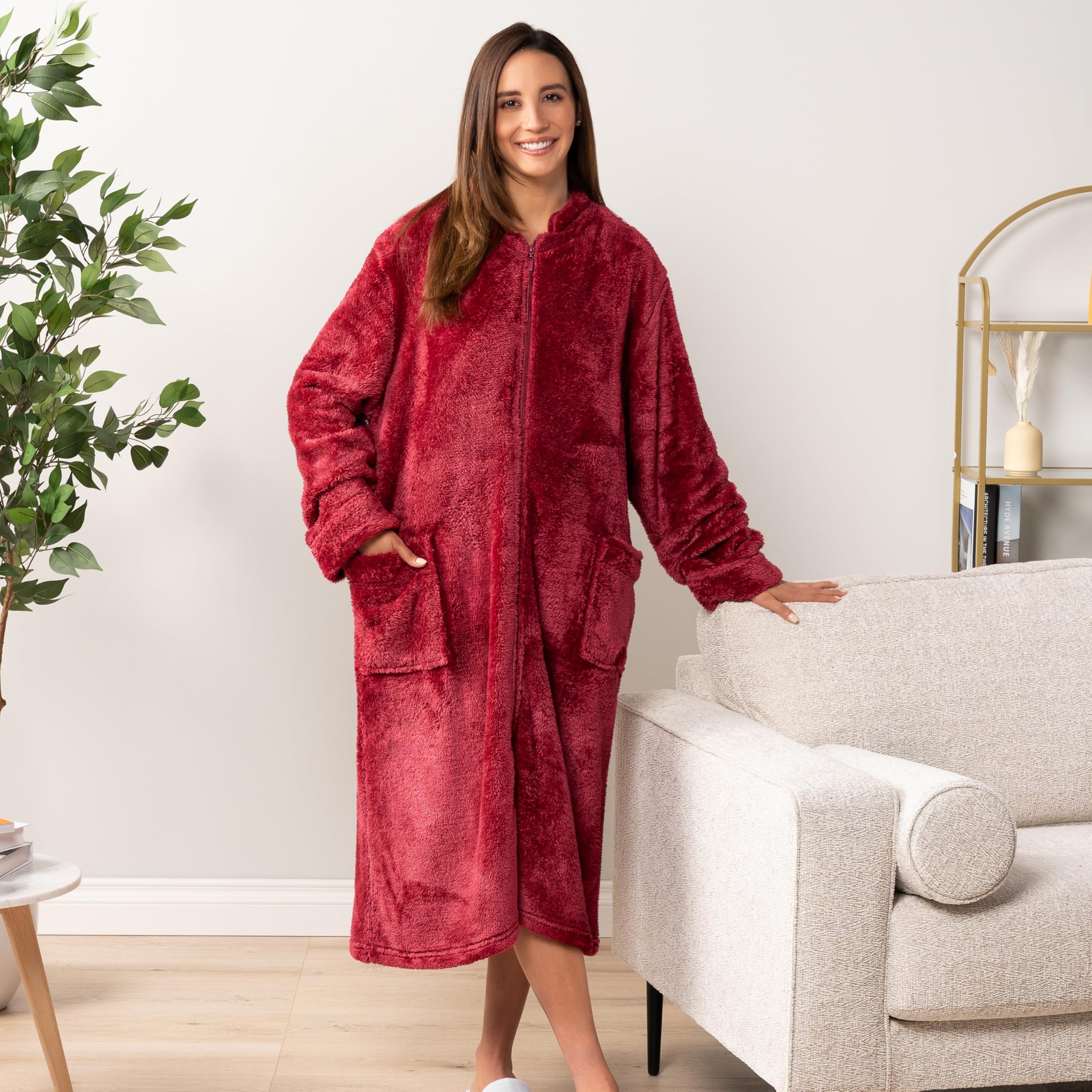 - SHERPA HOUSE COAT FOR WOMEN: Warm, fluffy, long sleeve housecoat robe for women features fuzzy sherpa material with full front zipper and pockets. Designed to be extra warm, comfortable, and soft. Our shaggy sherpa front zip robe is perfect for lounging and relaxing at home. Plush, warm, cozy, snug, makes it great for leisure, after shower, bath, sleep, maternity wear, surgery/hospital gown, pajama night robe, morning, and evening routines.